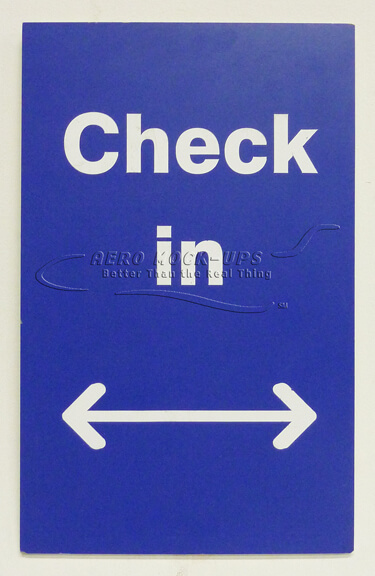 Sign, flat - "Check in" with arrows left & right. White on blue plastic. Artwork – Not cleared.